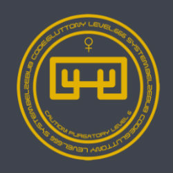 徽章上的文字:LEVEL:666 SYSTEM:BELZEBUBCODE:GLUTTONY CAUTION! PURGATORY LEVEL 6